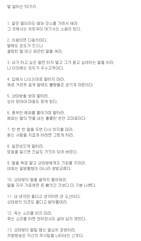오늘 우연히 검색하다가 매우 재미난 글이 있어서 찾아서 올려봅니다. 말 잘하는 50가지 방법이래요.ㅎㅎㅎㅎ 진짜 이렇게 방법이 많나요? 저도 너무나 말을 잘하고 싶은데, 너무 잘하고 싶은데, 쉽지 않던데, 여러분들 중에 그런 분 들 있으면 참고해보세요.
